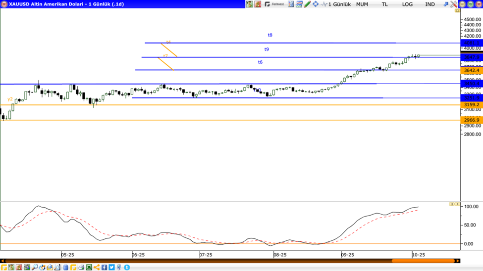 Altın da yaşanan gelişmeler alıcıları getirdi. ABD Hükümet kapanması, Jeopolitik endişelerin devam etmesi, Doların zayıflığı ve enflasyon etkisi yükselişi destekliyor. Ayrıca Merkez Bankalarının Altın alımları da etkili oluyor. Altın teknik olarak 3847 seviyesindeki simetrik direncini geçti. Bu seviyenin üzerinde kalırsa bir sonraki simetrik direnci 4081 seviyesinde.