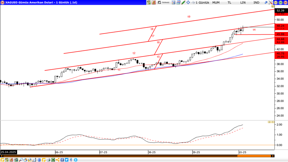 Gümüş teknik olarak kritik bir noktaya geldi. 48.24 seviyesindeki Yükselen kanal üst direnç çizgisini test ediyor. Bu seviyeden teknik satışlar da gelebilir, bu seviyeyi kırması da muhtemel. Ancak taktik olarak yeni alım yönlü pozisyon kanalı kırmadan alınmaz. Bu risklidir. Kanalı yukarı yönlü kırar bunu görürüz o zaman 48.24 seviyesini stop loss alarak alım yapmak doğru olacaktır. Mevcut pozisyon ise iki öneri vermek mümkün. Birisi, buradan sat kanalı kırarsa dön tekrar al. Diğer ise son gövdenin yarısı kadar seviye olan yaklaşık 47.50 seviyesi altına gelmedikçe pozisyonu koru. Bunun dışında da taktikler var. Size bağlı.