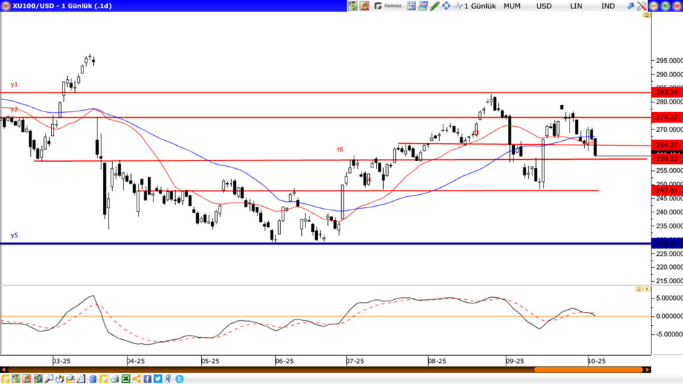 Endekste dalgalı seyir devam ediyor. Dolar bazında kesin bir trend oluşumundan bahsetmek zor. 259$ desteği yakın vade destek. Bu seviyenin kırılması ve tekrar üzerine geçmekte başarısız kalması durumunda 247$ desteğine doğru düşüş görürüz. Bu seviye iyi bir tepki alım noktası olacaktır. Buna karşın, 250$ seviyesinde tepki gelmesi durumunda ise 264$ direnç seviyesi olacak.