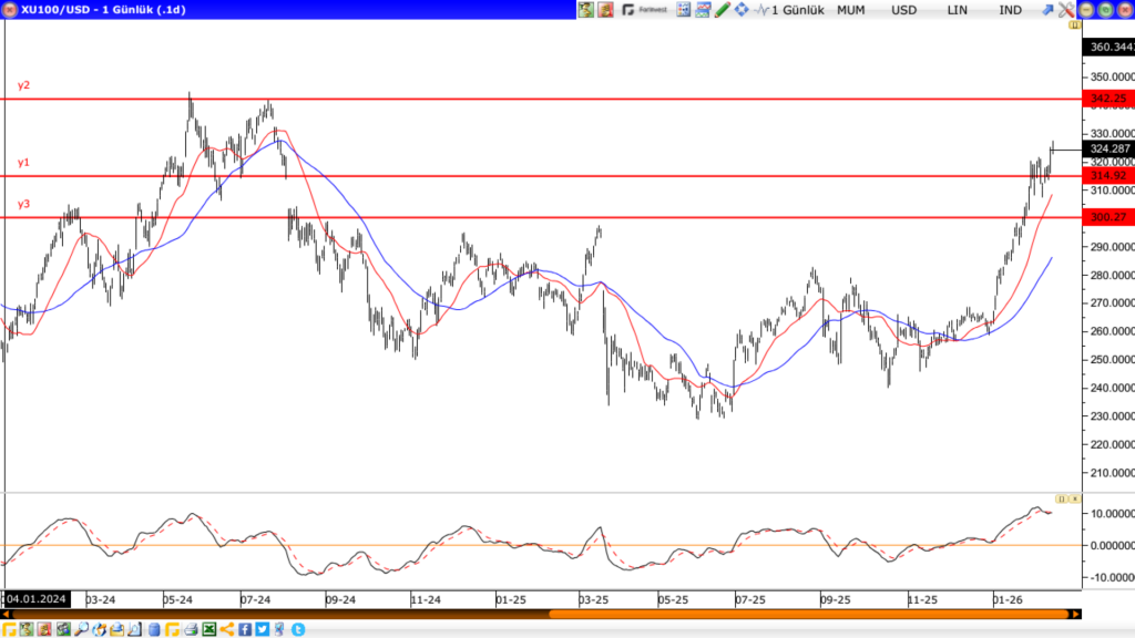 Bunun yanında Endeks 322$ seviyesinin üzerinde kapandı. Bir süre 300$ ile 322$ arasında yatay bir süreç düşüncem vardı. Bu hala mümkün. Buna karşın 322$ üzerinde ısrarlı seviyeler devam ederse 342$ direnci yeni hedef olacak.