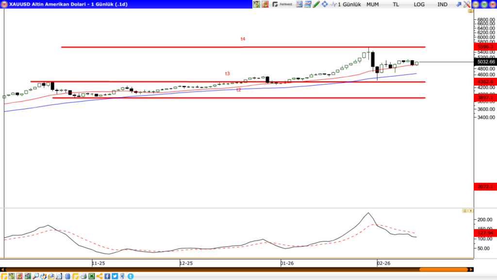 Sarı metal 30 Ocak tarihindeki büyük siyah mum’un etkilerini yaşıyor. Momentumda zayıflık var. Ancak bu Altını yatay bir seyirde tutuyor. ABD Dolar endeksi içinde aynı görünüm var. DXY 95-98 arasında dalgalanmakta. Bununla birlikte Altın için 5600 seviyesini bir süre zirve olarak izleyeceğiz. Aşağıda ise 4634 seviyesindeki 50 günlük ortalama destek olacaktır. Mevcut Altın pozisyonumu korurdum. Yeni bir pozisyon açmak için ise acele etmezdim.