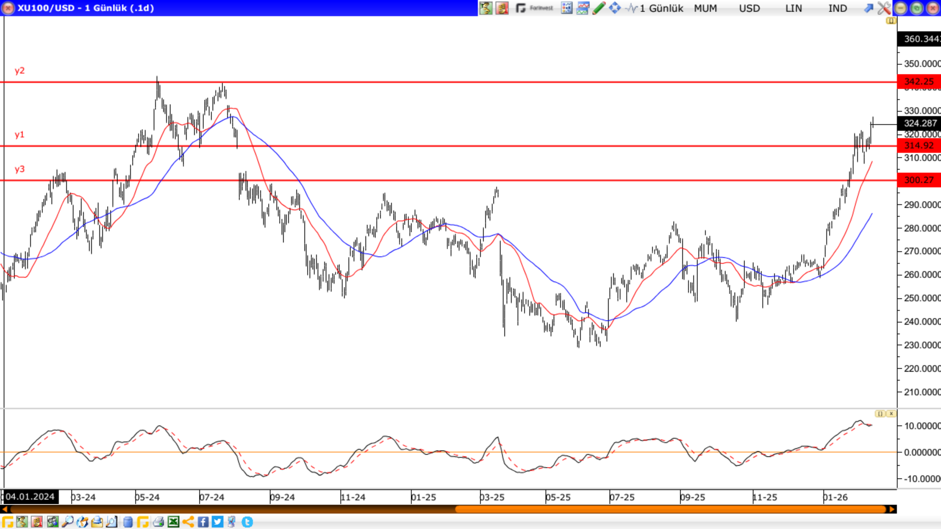 Bunun yanında Endeks 322$ seviyesinin üzerinde kapandı. Bir süre 300$ ile 322$ arasında yatay bir süreç düşüncem vardı. Bu hala mümkün. Buna karşın 322$ üzerinde ısrarlı seviyeler devam ederse 342$ direnci yeni hedef olacak.