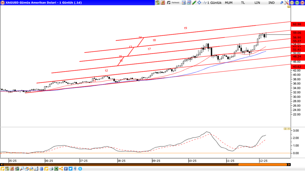 Gümüş 54.40 direncini geçmesinin ardından 59.40 kanal direncini test etti ve bu direnç çalışıyor. Momentumda bir miktar azalma var ancak grafik halen güçlü. Endüstriyel etkilerin artması ve gümüş talebini beslemesi, ABD ‘nin Gümüş’ü kritik mineral listesine alması gibi gelişmeler emtianın ralli yapmasına neden olmuş durumda. 59.40 kanal direncini de geçerse momentum güçlenir ve 63.60 kanal direncine doğru yükseliş gösterecektir.