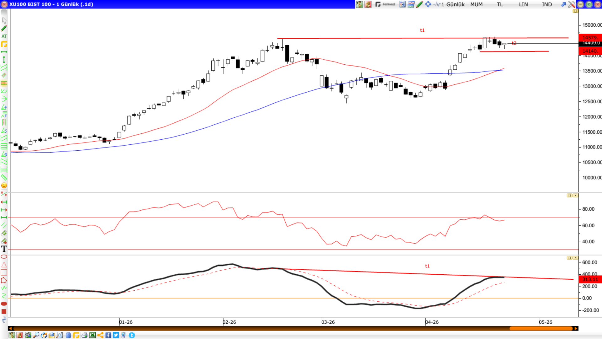 Borsa endeksindeki teknik görünüm biraz ilginç olmaya başladı. 14532 zirvesinin üzerini gördükten sonra bu seviyenin altına gelmesi, teknik olarak ikili tepe endişesi yaratıyor. Ancak bunu söylemek için bu formasyonun onaylanması lazım. Yani satışların biraz daha derinleşmesi, ikili tepeyi getirebilir. Bunun için 14140 seviyesindeki küçük yatay destek önemli. Bu seviyenin altına gelmesi durumunda satışlar belirginleşecektir ve ikili tepe formasyonu gündeme gelecektir. Bu durumda endekste çıkışın başladığı 12600-13000 bölgesine bile düşüşler beklenir. Ancak ondan öncesinde 13500 seviyelerinde güçlü 22 ve 50 günlük ortalamalar güçlü destek olacaktır.