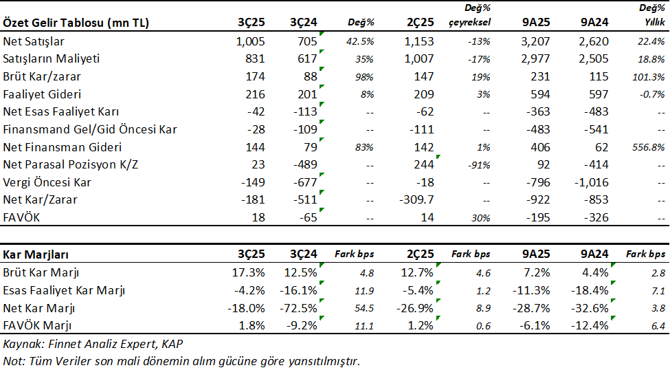 FAVÖK ise 18mn TL ile düşük ama pozitif bölgede oldu. Geçen yıl 65mnTL negatif FAVÖK vardı. Aslında Şirket 2Ç dönemde 5 çeyrek sonra ilk kez pozitif FAVÖK açıklamıştı. 3Ç dönemde devam etmiş. 9 aylık dönemde ise 195mnTL FAVÖK zararı var. 3Ç25’de FAVÖK marjı %1.8 oldu. Bu geçmiş yıllardaki %18-20 FAVÖK marjından oldukça uzak.