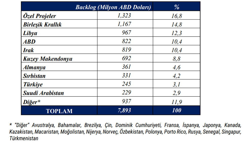 ENKAI’nin Haziran sonu itibari ile toplam backlog tutarı 7.893mn$ seviyesinde. Buna karşın 2024 yılı sonunda bu tutar 5.834 mn $ seviyesindeydi ve yılbaşından bugüne dolar bazında %35 büyümeyi işaret ediyor. Bu büyüme oldukça iyi çünkü backlog büyümesi, gelir artışının istikrarlı şekilde artması açısından önemli. 30 Haziran 2025 dönemine ait faaliyet raporunda Backlog dağılımı mevcuttur. Aşağıda tablo olarak görebilirsiniz.
