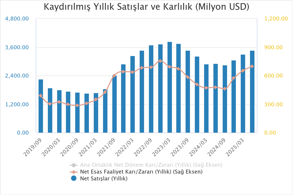 Aşağıdaki grafikte ENKAI’nin yıllıklandırılmış Esas Faaliyet Karı ve Satış Gelirlerinin seyrini görüyoruz. 2023/03 dönemi satış gelirlerinin 3.837mn$ ile zirve yaptığı bir dönem. Aynı dönemde Esas Faaliyet karında gerileme başladığını görüyoruz. Bu gerilemenin 2024/06 dönemine kadar sürdüğü ve sonrasında tekrar yükselişe geçtiğini görmekteyiz. Aynı dönemlerde hisse fiyatınında Dolar bazında 2023/03’den itibaren 1.62$ seviyelerinden 0.98$ seviyelerine kadar düştüğünü, buna karşılık 2024/06 döneminden itibaren ise yükselişe geçtiğini ve 1.80$ seviyesine geldiğini görüyoruz. Bu aslında diğer yanda Borsa’nın uzun vadede ne kadar rasyonel olduğunu bize gösteriyor.