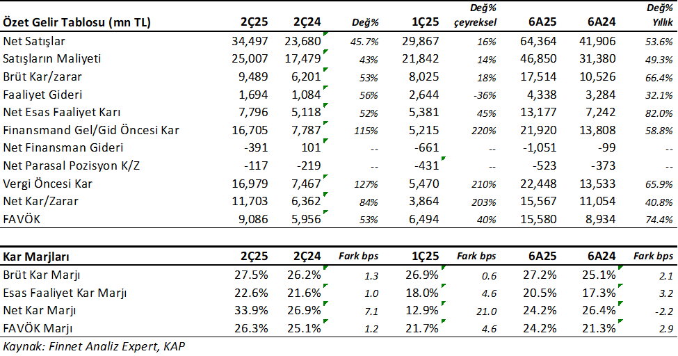 Bu sonuçlarla birlikte ENKAI 2025 yılının ilk yarısını %41 artışla 15.567mnTL net kar ile kapadı. Satış gelirleri %53.6 büyüdü ve 64.364mn TL oldu. FAVÖK %74.4 büyüdü ve 15.580 mn TL oldu.