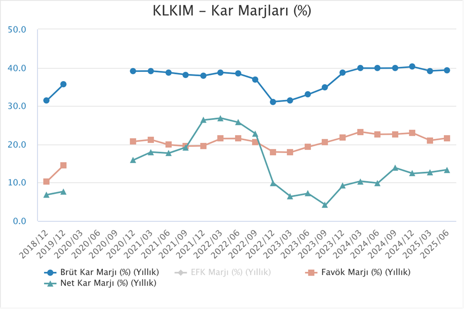Şirket bu dönemde %39 Brüt Kar Marjı, %21.4 FAVÖK Marjı ve %11.1 Net Kar marjı ile çalıştı. Aşağıdaki grafikte KLKIM’ in kar marjlarını görmektesiniz. Genel olarak yüksek Brüt Kar Marjına sahip bir şirket olmanın yanı sıra, FAVÖK Marjının %20 çevresinde istikrarlı bir yapıya sahip olduğunu görmekteyiz. KLKIM için istikrarlı ve iyi yönetilen bir şirket demek yanlış olmaz.