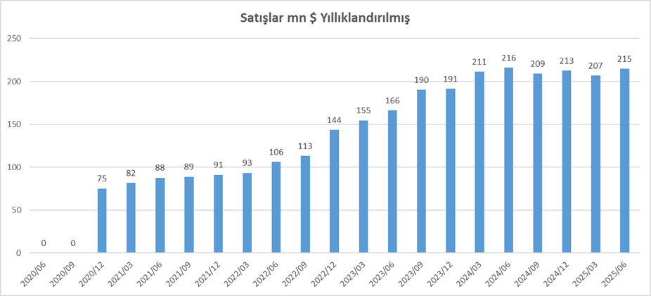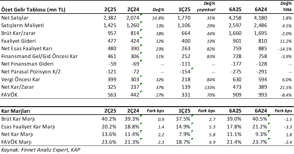2Ç25’de satış gelirleri reel %14.8 büyüme ile 2.382mn TL oldu. Satışların %68’i yurtiçine olurken, ihracat %30 oldu. Kalan diğer satışlardan oluştu. KLKIM bu dönemde %40.2 brüt kar marjı ile çalıştı. Hem yıllık hem çeyreklik dönemde marj yükseldi.