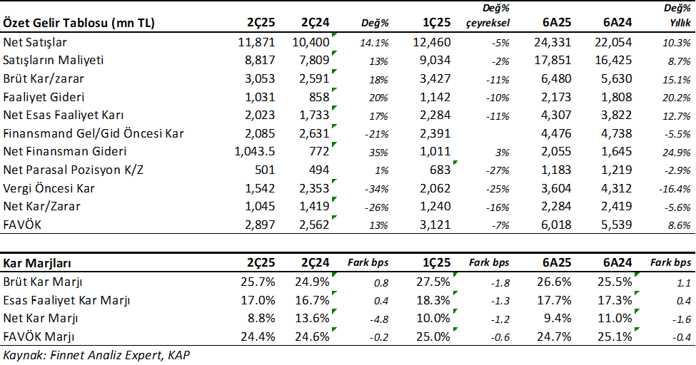 Şirket bu sonuçlarla birlikte 2025 yılının ilk yarısını %10.3 reel büyüme ile tamamladı ve 24.331 mn TL ciroya ulaştı. Net kar %5.6 gerileme ile 2.284 mn TL düzeyinde oluşurken, 2024 yılının aynı dönemindeki tek seferlik gelir hariç bakıldığında Net Karda %25 artış hesaplanıyor. FAVÖK ise %8.6 artışla 6.018 mn TL düzeyinde oluştu.