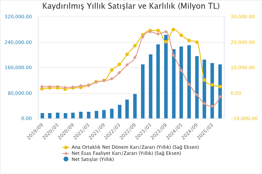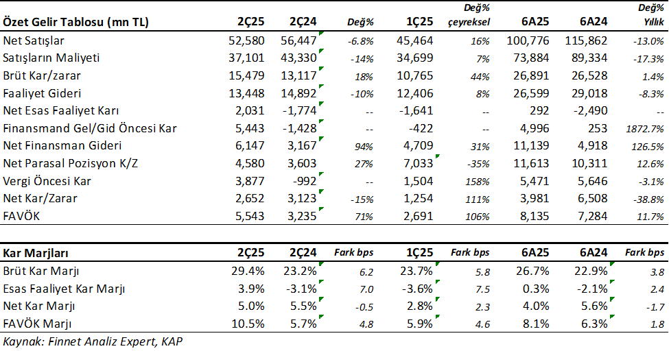 Satış gelirleri 2Ç25’de beklentilerin %4 üzerinde 52.580mnTL gelirken, uluslararası satışların toplam satışlar içerisindeki oranı %62 seviyesinde oldu. Bu çeyrekte satışlar yıllık reel %6.8 geride kaldı. Ancak brüt kar marjı 6.2 puan artışla %23.2’den %29.4’e yükseldi. 1Ç25’de %23.7 olmuştu. Şirket yayınladığı basın bülteninde maliyet kontrolü ve verimliliğin artırılmasına yönelik aldıkları aksiyonların olumlu sonuçlarını görmeye başladıklarını ifade ediyor. Bakarsak, satışlar %6.8 gerilerken, maliyetlerin daha fazla %14 gerilediğini ve Faaliyet giderlerinin de daha fazla %10 gerilediğini görürüz.
