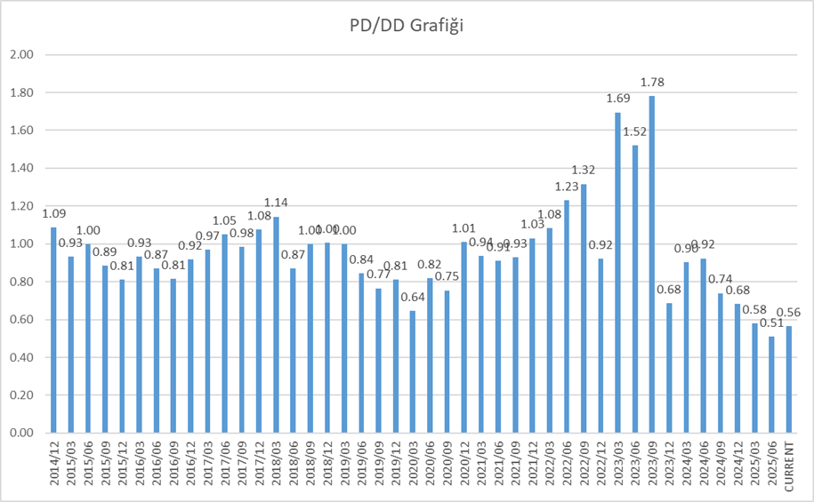 Hisse 0.56x pd/dd çarpanı ile işlem görmekte. Grafikten göreceğiniz gibi 2014 yılından bu yana en düşük ikinci seviye. Bir önceki 2025/03 döneminde 0.51x ile güzel bir fırsat vermiş. Özsermaye değerine göre bu seviyelerin uzun vadeli pozisyon için uygun noktalar olduğunu söylemek zor değil.