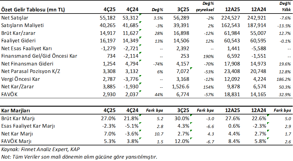 Satış gelirleri 4Ç25’de %3.5 yıllık reel artışla 55.182mnTL oldu. Burada beklenti 51.000mnTL idi. Brüt kar marjı ise %27 ile yıllık 5.2 puan yükseldi. Buna karşın 3Ç25’e göre 3 puan düştü.