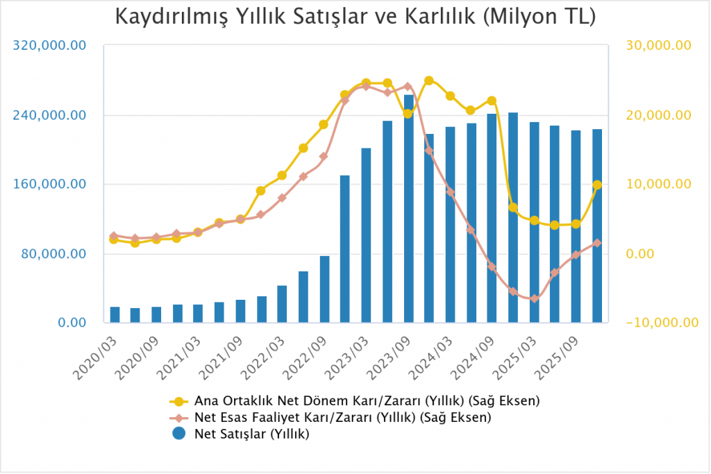 Bu sonuçla birlikte SISE 2025 yılını %50.3 reel artışla 9.878mnTL net karla kapadı. Satış gelirleri reel %7.6 düştü ve 224.527mn TL oldu. Klasik Analist FAVÖK ise %32.9 reel artışla 18.831mn TL seviyesinde kapadı.
