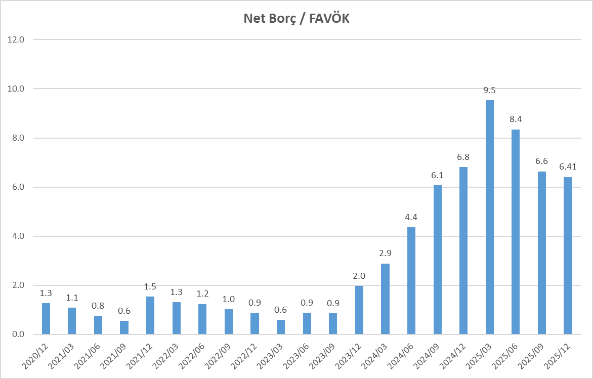 SISE Cam 2025 yılını %8.4 FAVÖK marjı ile kapadı. Kar marjı son çeyrekteki düştü ancak 2024 yılındaki %5.8 seviyesine göre daha iyi seviyeye geldi. Ancak alışık olduğumuz %20 seviyelerinden halen uzak. Aşağıdaki grafikte SISE için tarihsel değerleri görebilirsiniz.