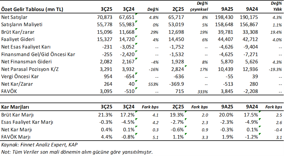 Şirket 9 aylık dönemde cirosunu reel %4.3 artırdı. 2025 hedefi +/- %6 reel büyüme. FAVÖK marjının ise +/- 0,5% sapma olmak üzere %2 olmasını bekliyor. 9 aylık FAVÖK marjı %1.9 oldu. Geçmiş yıllardaki favök marjından oldukça uzak ama son 3 dönemdir yukarı bir trend var.