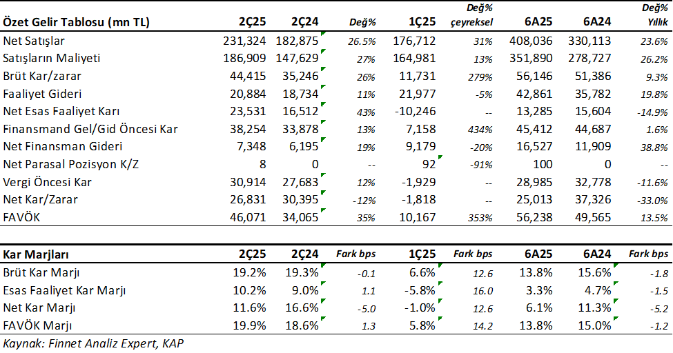 Türk Hava Yolları (THYAO) 2Ç25’de beklentilerin %13 üzerinde 26.831mn TL net kar açıkladı. Analist medyan beklentileri 23.728mnTL seviyesindeydi. Sezonsal etkiyle yolcu gelirlerindeki artış, maliyet baskısındaki azalma ve faaliyet giderlerinin önceki çeyreğe göre gerilemesi son olarak önceki çeyreğe göre daha düşük net finansman gideri oluşması net karı destekledi. 2Ç25’de net kar yıllık %12 geriledi. 1Ç25’de Şirket 1.818mn TL zarar açıklamıştı.