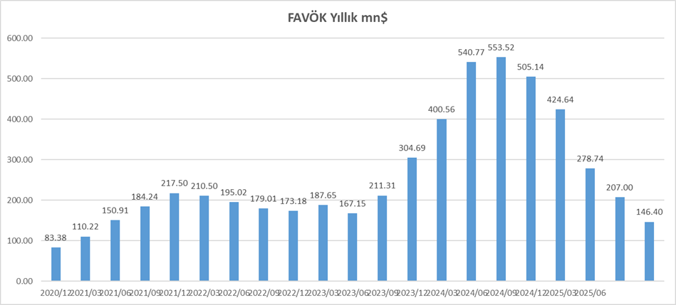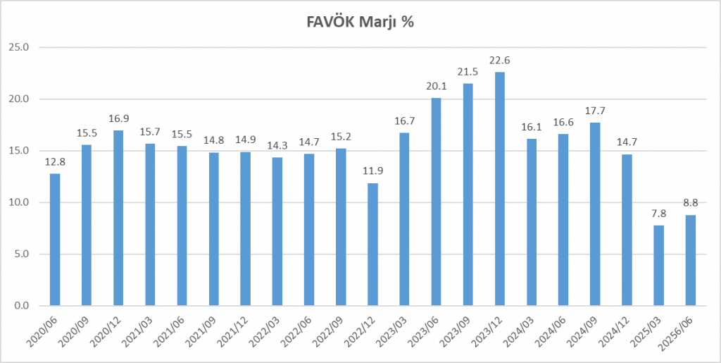 FAVÖK aynı dönemde 1.232mn TL olurken, yıllık bazda 65.96% azalış gösterdi. Çeyreklik 17.41% büyüdü. FAVÖK marjı aynı dönemde 10.16% seviyesinde oluştu. Önceki çeyrekte 7.78% , geçen yıl aynı dönemde 17.24% olmuştu. Favök marjındaki iyileşmede Brüt kar marjı ve Esas Faaliyet karındaki artış etkili oldu.