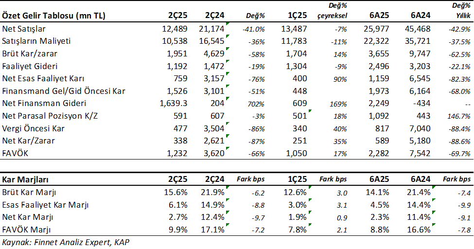 Yine 2Ç25 döneminde Satış gelirleri beklentilere paralel 12.489mn TL seviyesinde gerçekleşti. Satışlar önceki çeyreğe göre 7.40% azalırken, geçen yıl aynı döneme göre yıllık 41.01% küçüldü. Brüt kâr marjı 2Ç25’de 15.62% oldu. Önceki çeyrekte 12.64% ve geçen yıl aynı dönem 21.86% olmuştu.