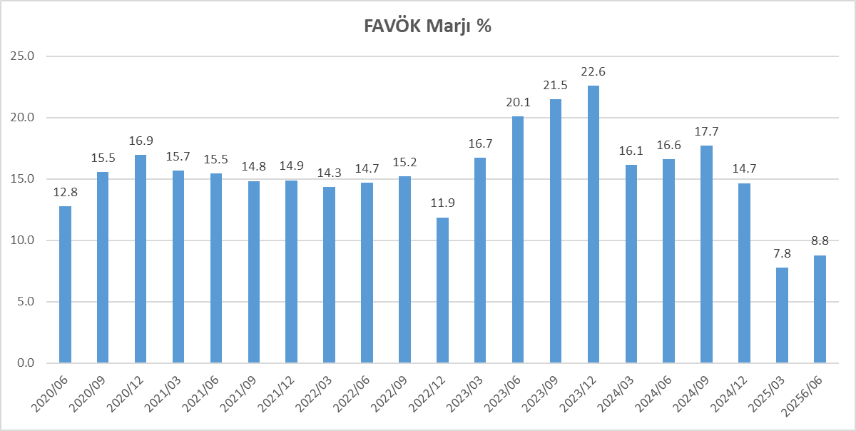 FAVÖK aynı dönemde 1.232mn TL olurken, yıllık bazda 65.96% azalış gösterdi. Çeyreklik 17.41% büyüdü. FAVÖK marjı aynı dönemde 10.16% seviyesinde oluştu. Önceki çeyrekte 7.78% , geçen yıl aynı dönemde 17.24% olmuştu. Favök marjındaki iyileşmede Brüt kar marjı ve Esas Faaliyet karındaki artış etkili oldu.